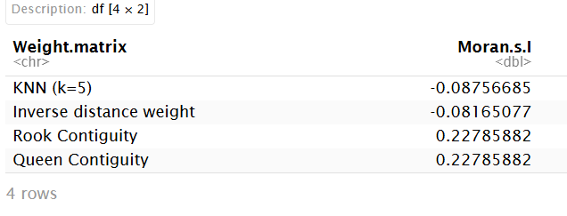 "Weight matrix"=c("KNN (k=5)", "Inverse distance weight", "Rook Contiguity", "Queen Contiguity"),
