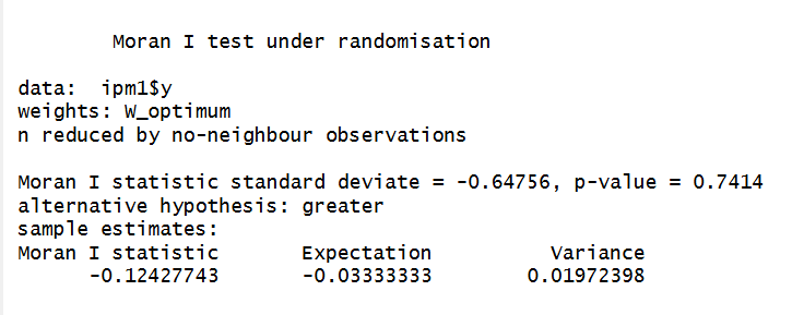 MI.queen <- moran.test(ipm1$y, W.queen.s, randomisation = TRUE, zero.policy = TRUE)