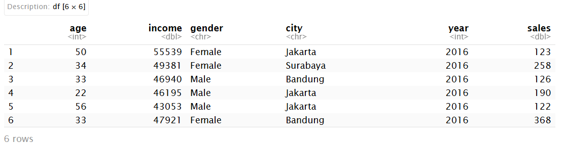 city = sample(c("Jakarta", "Bandung", "Surabaya"), 50, replace = TRUE),