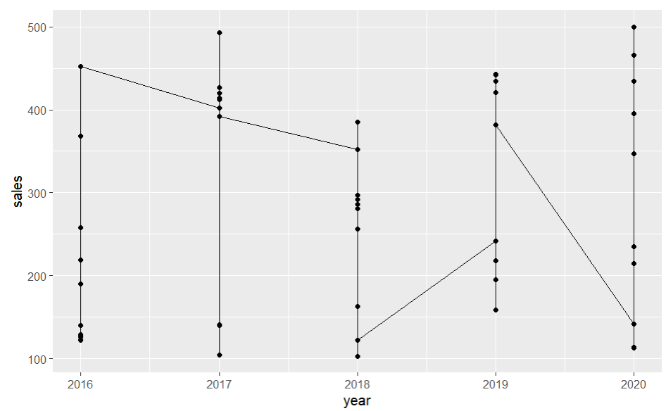 ggplot(data, aes(x = year, y = sales)) + geom_line() + geom_point()