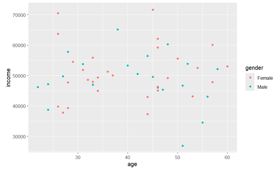 ggplot(data, aes(x = age, y = income, color = gender)) + geom_point()