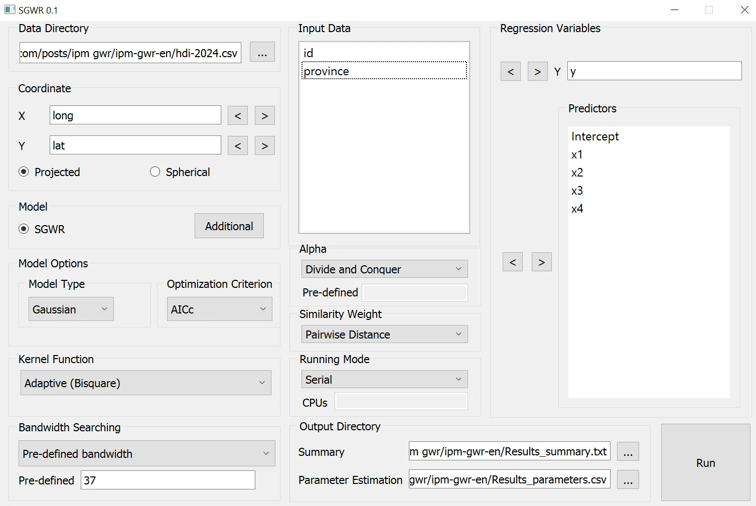 - x4: Shows a fairly wide variation (Min: 0.154, Max: 0.355). This proves the existence of spatial non-stationarity—policies or x4 factors might be very effective in one province but less so in a neighboring one.